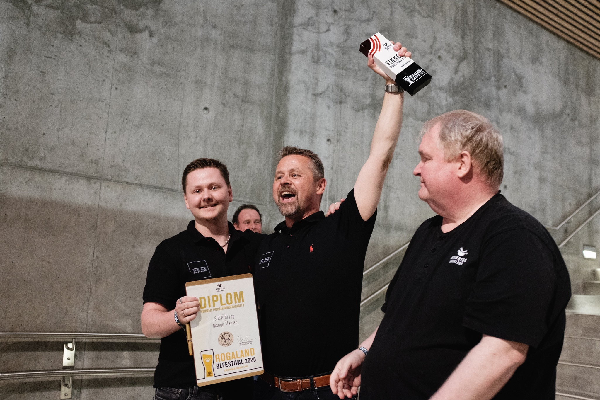 B.R.A. Brygg, her representert ved sjefbrygger Bengt Rune Andersen (i midten) og hans sønn Fredrik Hunsbeth Andersen (til venstre), vant publikums gunst og fikk aller flest stemmer under Rogaland Ølfestival 2025. Til høyre leder i Norbrygg Rogaland og festivalgeneral Ole Nærheim.
